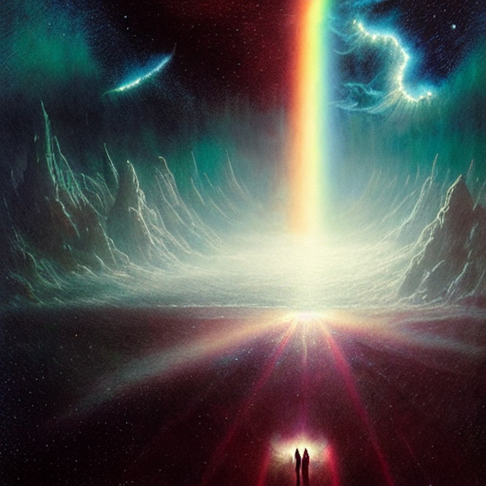 film grain, Flock of birds, surreal, space, light rays, galaxy, hell, black rainbow, space, stars, rainbow, comet, horror Gustave Doré Greg Rutkowski, James Gurney