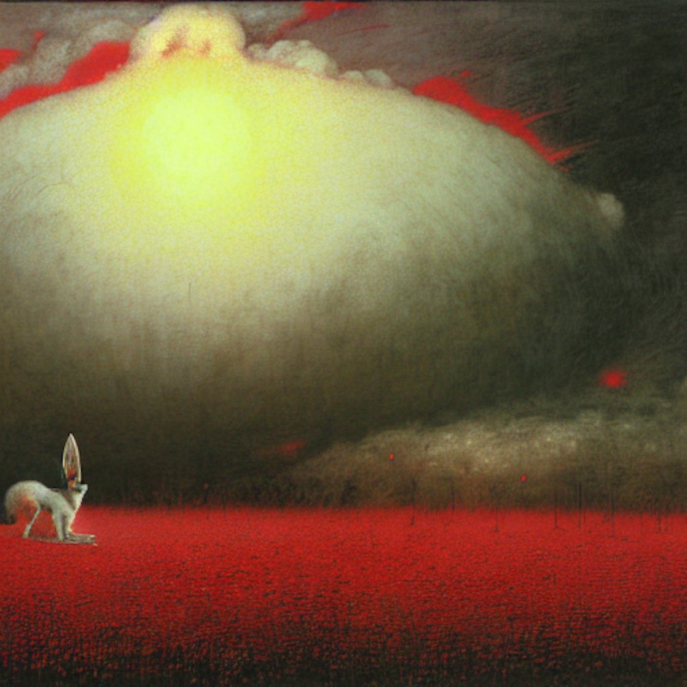 White Fox , eclipse, red sky, farm, horror, cornfield, by Ayami Kojima, beksinski, Amano, Francisco Goya, Beksinski painting, Adrian Ghenie, Takato Yamamoto. Greg Rutkows, detailed, classicism, intricate, detailed. jean pierre ugarte, albert bierstadt,