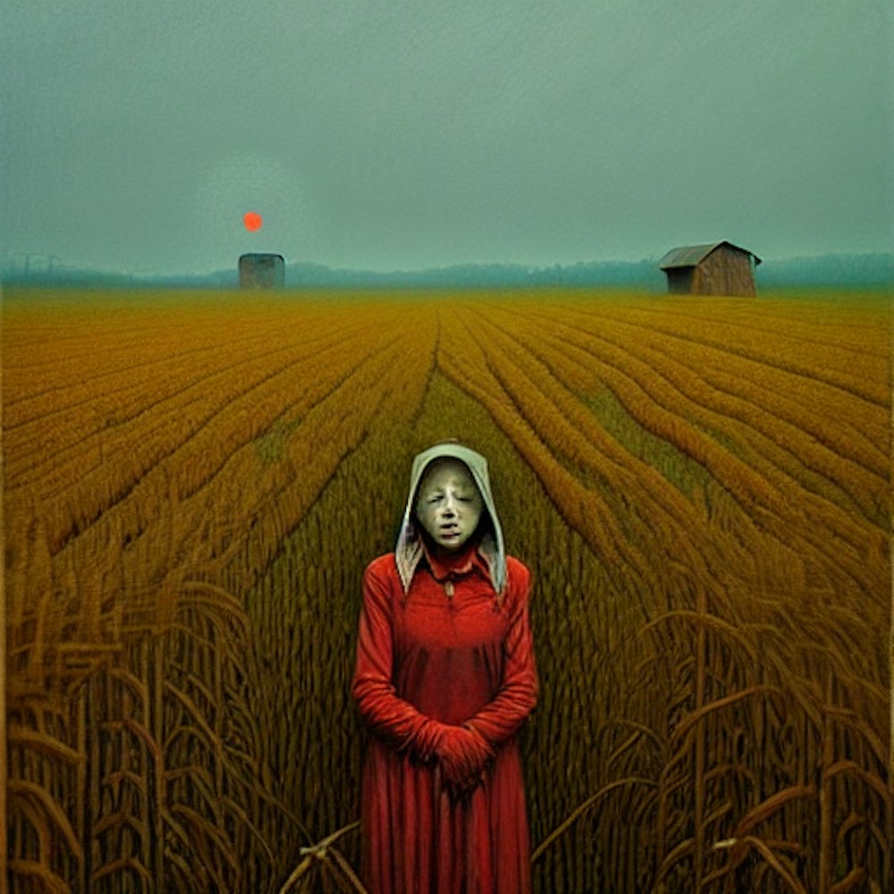 The mysterious stranger, bloody, farm, corn field by Dario Puggioni, Bom.K, Ally Burke, Zdzislaw Beksinski