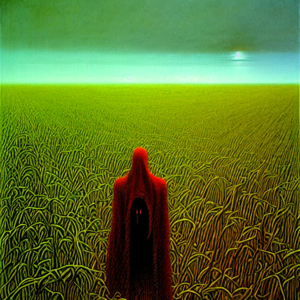 The mysterious stranger, bloody, farm, corn field by wayne barlowe, Zdzislaw Beksinski