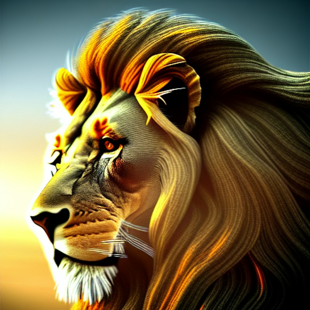 Lion awakening at sunrise, photo realistic, dramatic, after rain, majestic, king