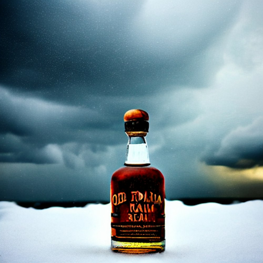 Realistic photo of old bottle of rum in the middle of the storm