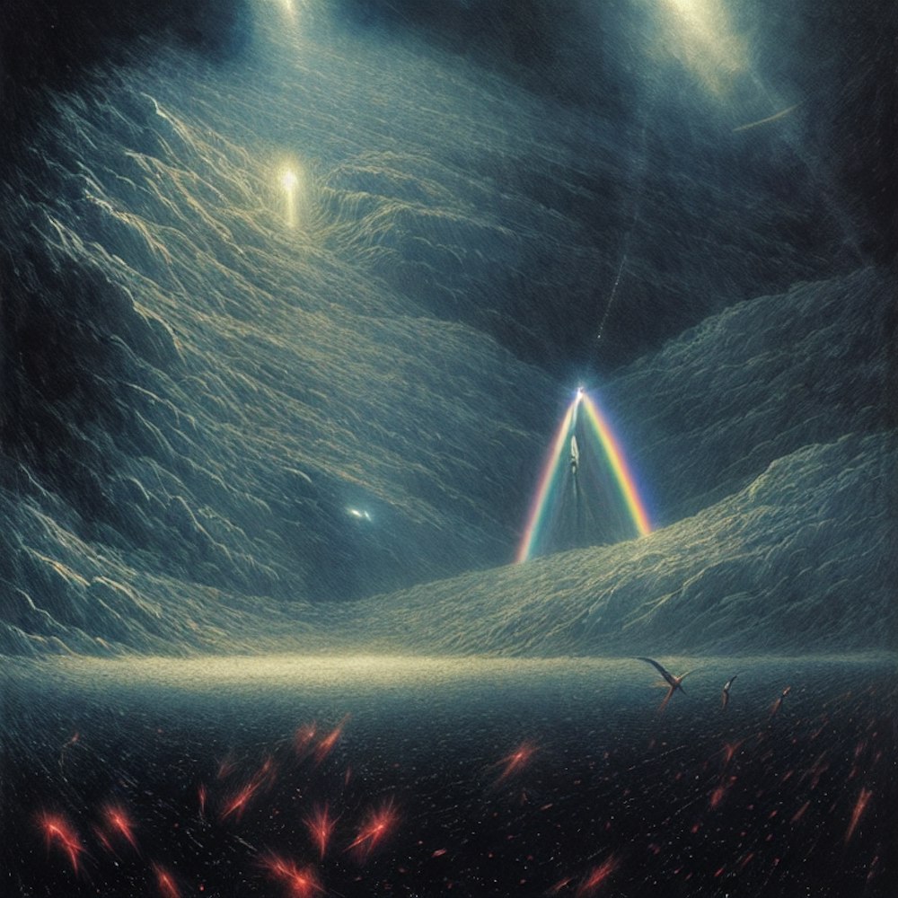 film grain, Flock of birds, surreal, space, light rays, galaxy, hell, black rainbow, space, stars, rainbow, comet, horror Gustave Doré Greg Rutkowski, James Gurney