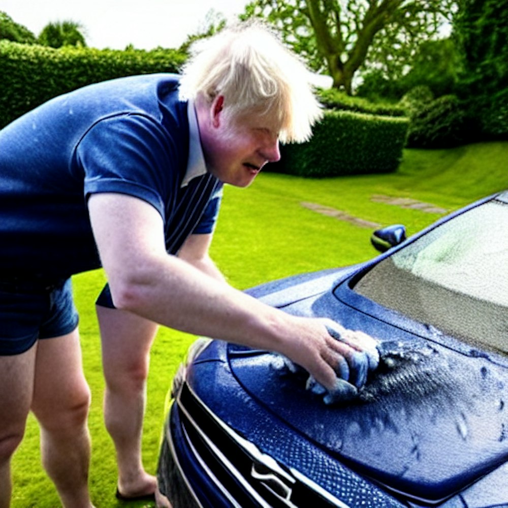 Boris Johnson in denim shorts washing a car on a really hot day outside his house on the driveway