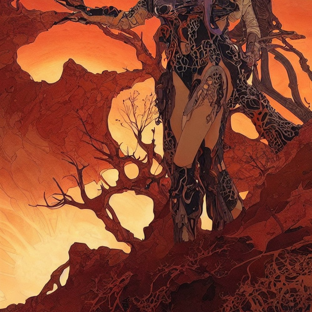 desert. burned trees, planet, intricate, Centered. Dittmann, Artgerm, WLOP, Mucha. Concept art. Planets, Space. Dynamic lighting. Regal. Bagshaw, Chevrier, Ferri, Kaluta, Minguez, Johansson.