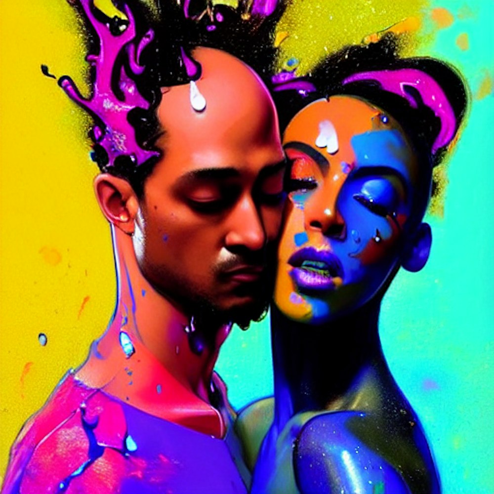 Fluorescent feeling, neo soul couple, dance, love, sex, beautiful painting with colourful by greg rutkowski, with drip and splash paint effect