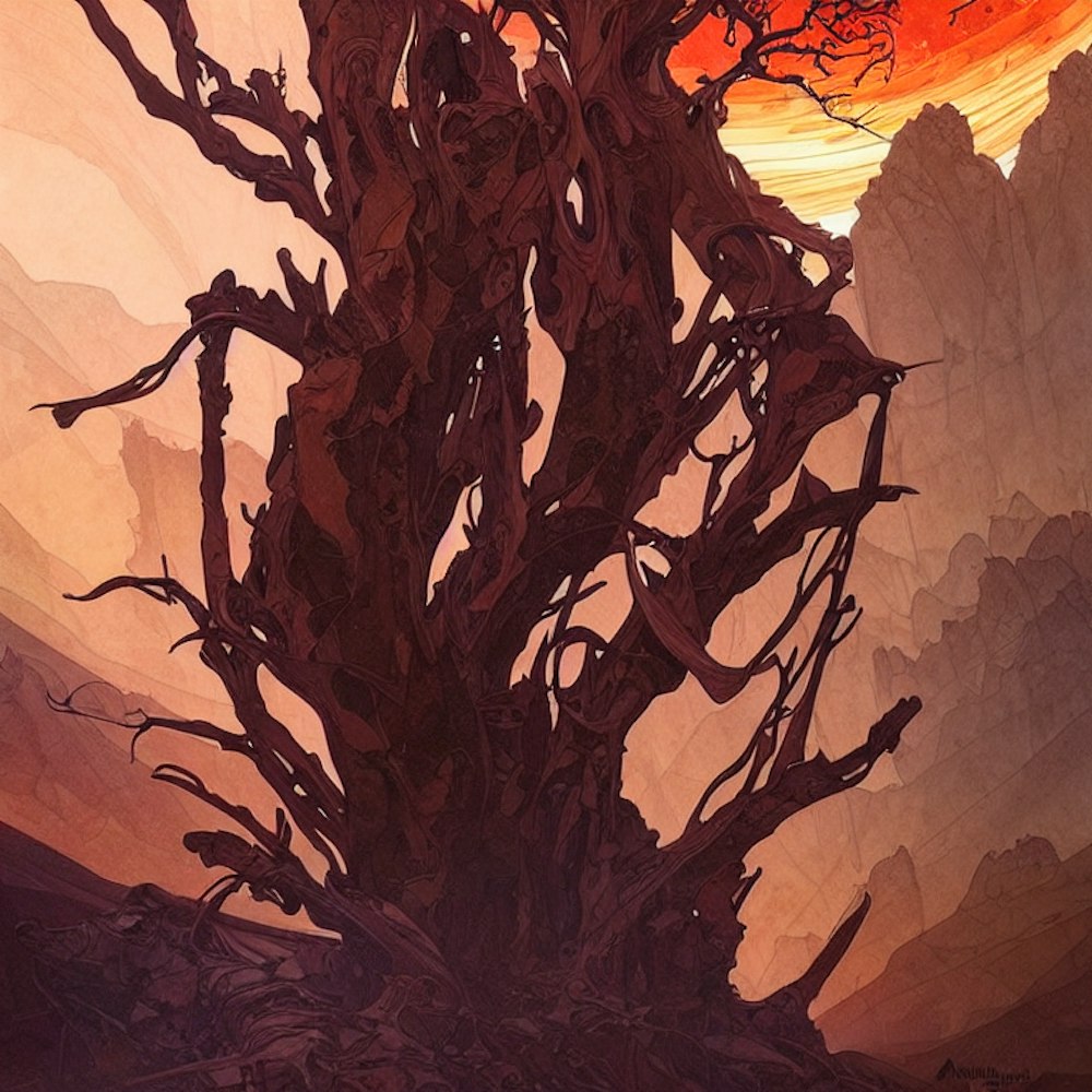 desert. burned trees, planet, intricate, Centered. Dittmann, Artgerm, WLOP, Mucha. Concept art. Planets, Space. Dynamic lighting. Regal. Bagshaw, Chevrier, Ferri, Kaluta, Minguez, Johansson.
