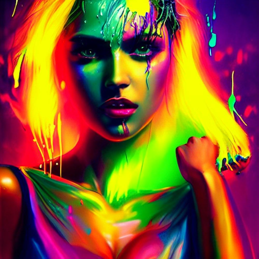 Fluorescent feeling, playmate, sexy, dance, love, beautiful painting with colourful by greg rutkowski, with drip and splash paint effect