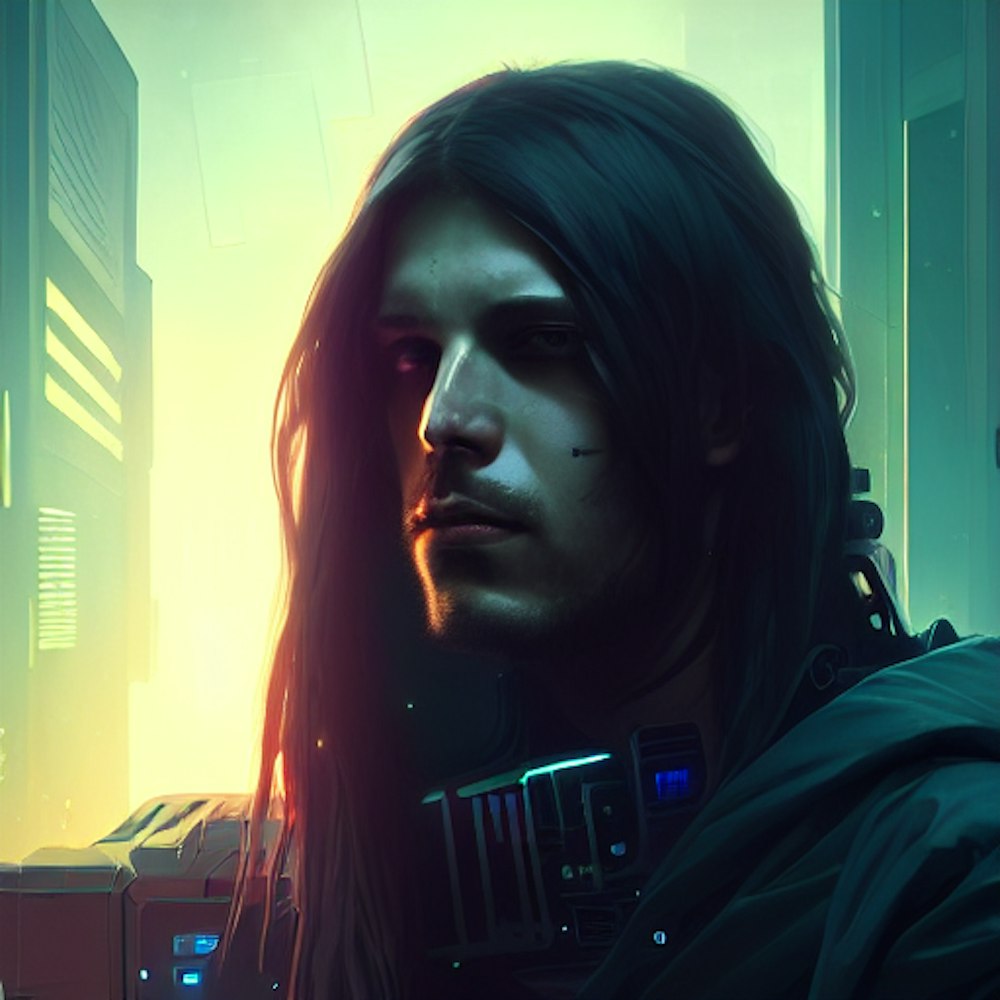Faceless male Cyberpunk cyborg rebel leader with long hair