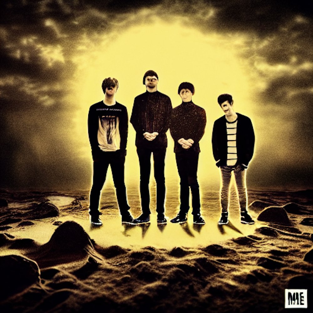 Make an album cover for a 4 member band photo, based on these 4keywords Man nature time space