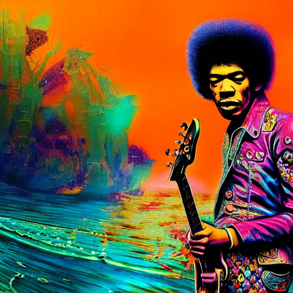1960s London music scene, Psychedelic, by Jimi Hendrix, in the style of Keep on Truckin