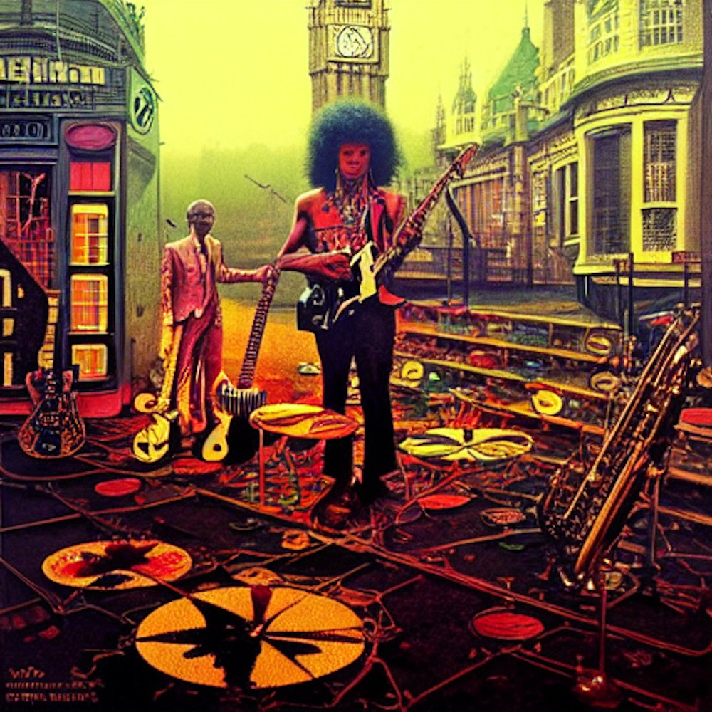 1960s London music scene, Psychedelic, by Jimi Hendrix, in the style of Keep on Truckin