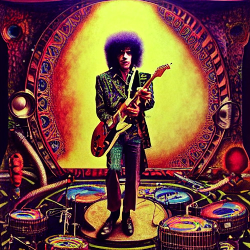 1960s London music scene, Psychedelic, by Jimi Hendrix, in the style of Keep on Truckin