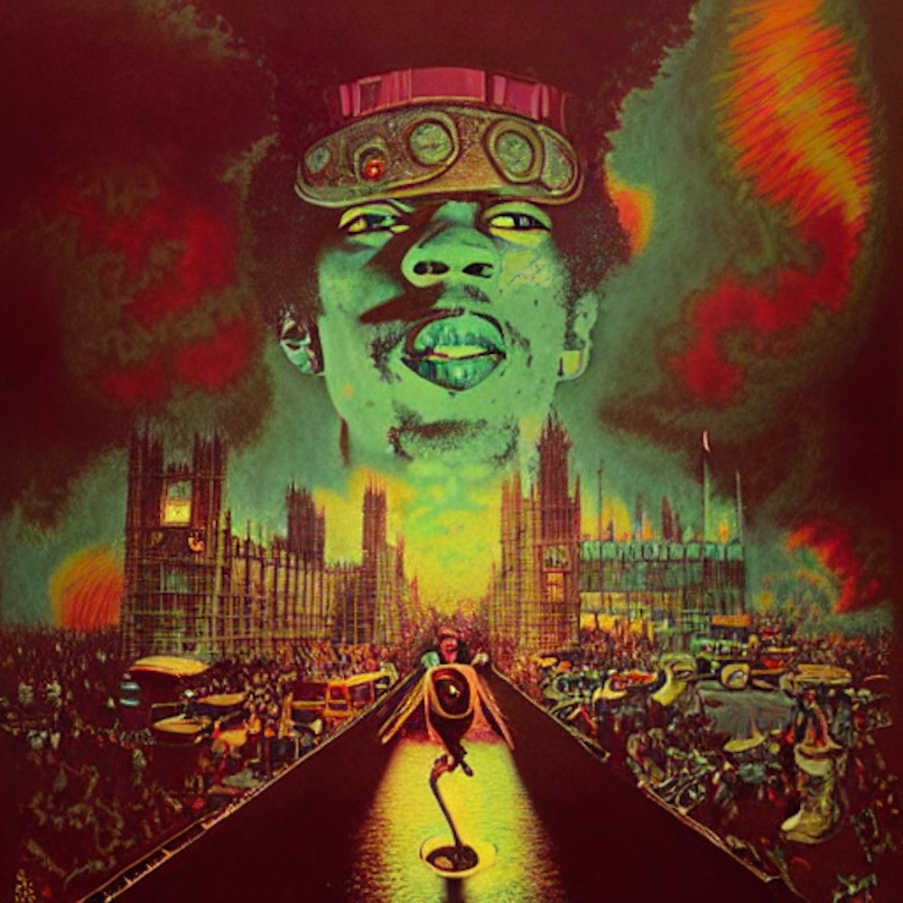 1960s London music scene, Psychedelic, by Jimi Hendrix, in the style of Keep on Truckin