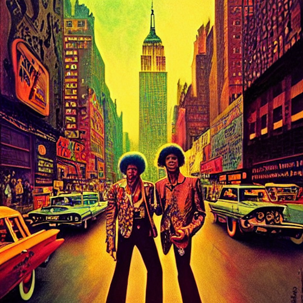 1960s New York music scene, Psychedelic, by Jimi Hendrix, in the style of Keep on Truckin