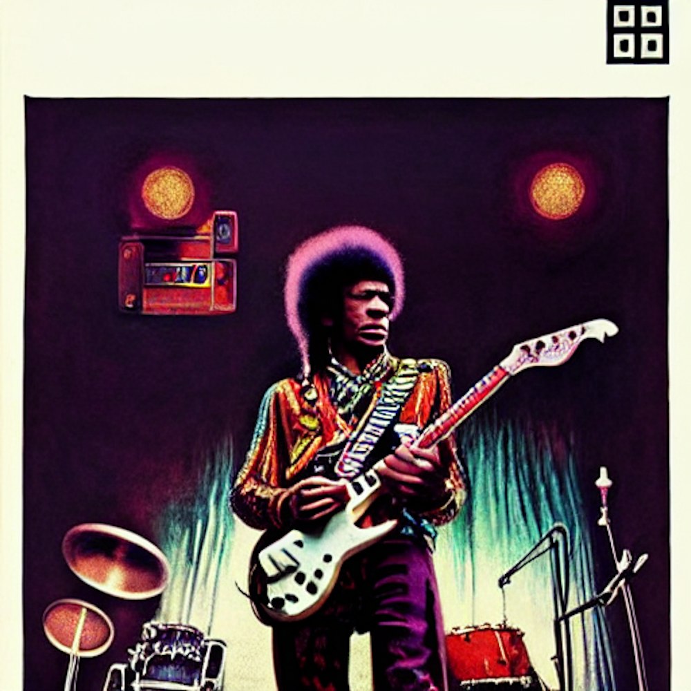 1960s New York music scene, Psychedelic, by Jimi Hendrix, in the style of Keep on Truckin