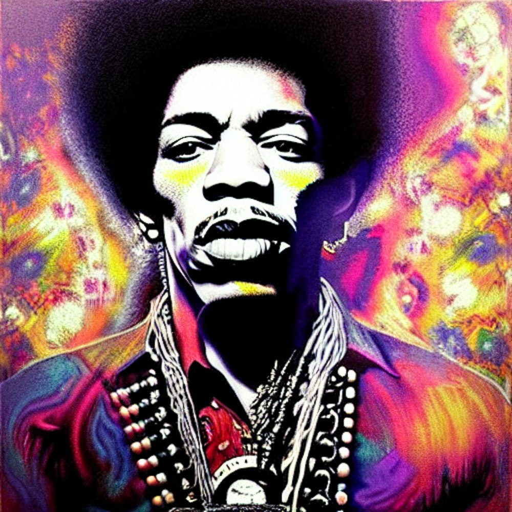 1960s New York music scene, Psychedelic, by Jimi Hendrix, in the style of Keep on Truckin