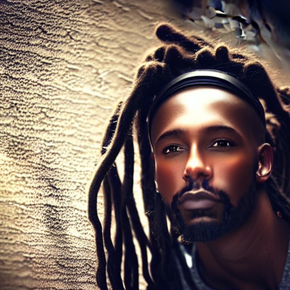 black man with long dreads sitting on a wall looking down