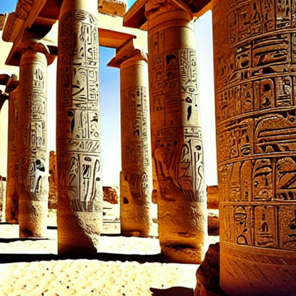 Ancient Egypt with 2 big pillars with ancient writing in the pillars . With sand on the ground