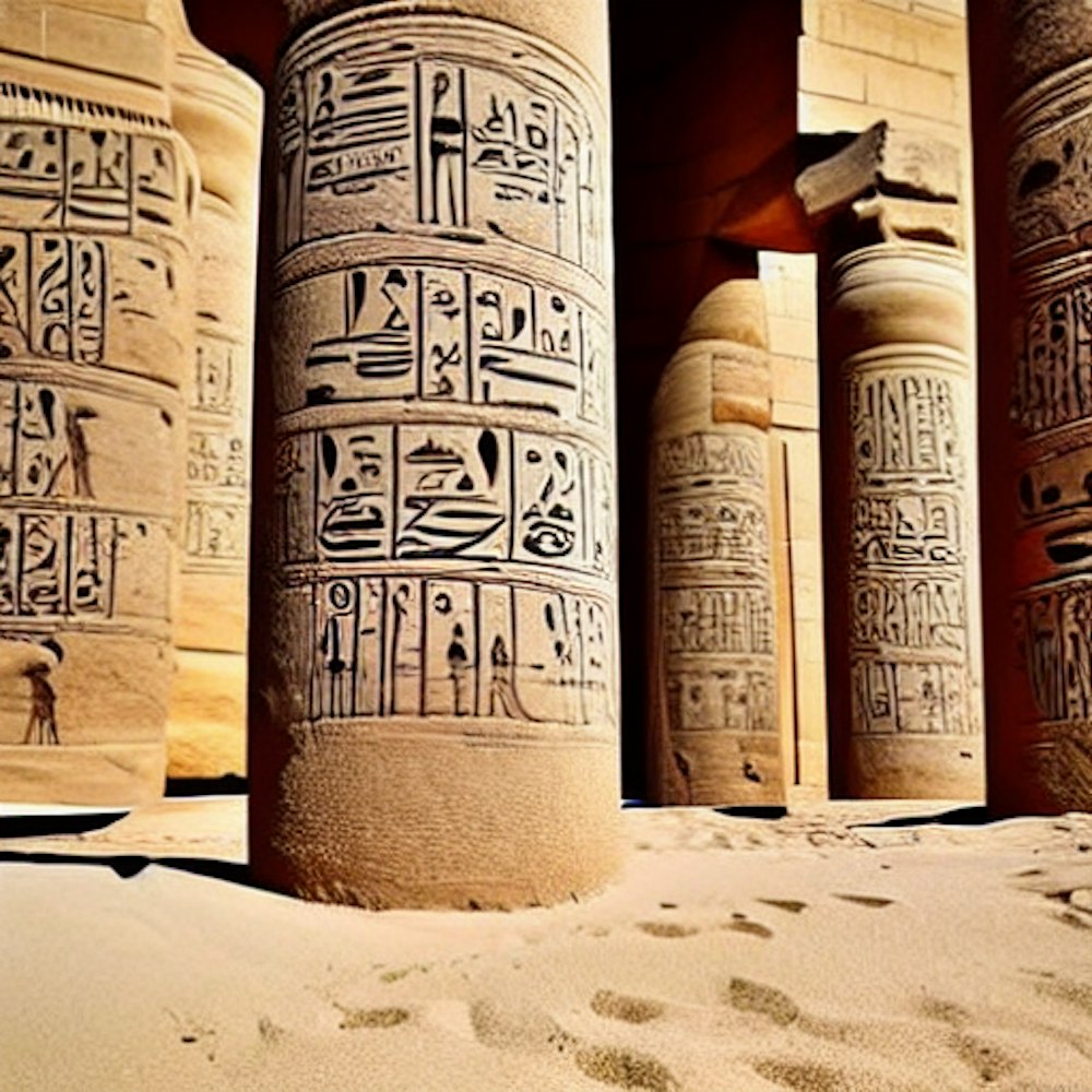 Ancient Egypt with 2 big pillars with ancient writing in the pillars . With sand on the ground