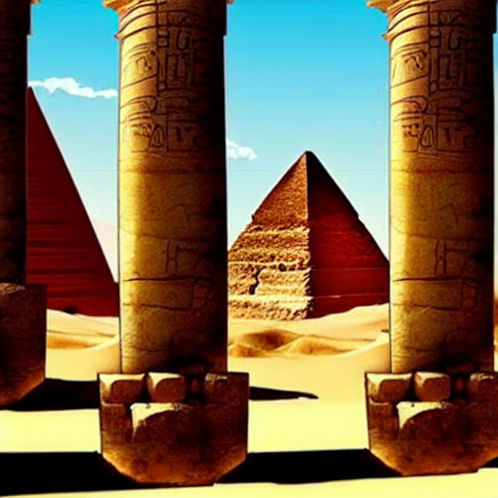 Ancient Egypt with 2 big pillars with ancient writing in the pillars . With sand on the ground