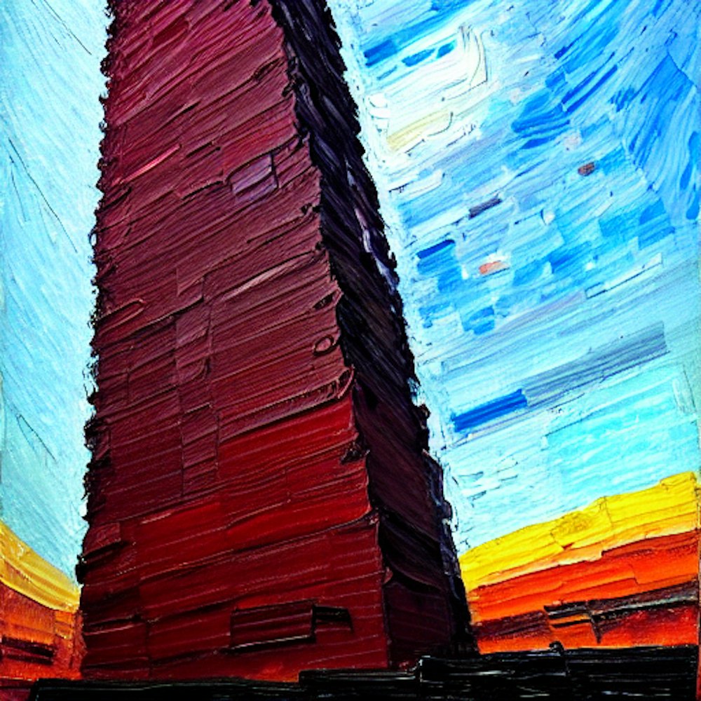 looking up at a huge towering monolith that is a dark red and black colour, blue and orange background, POV perspective, Painting in the style of Ivan Seal's works