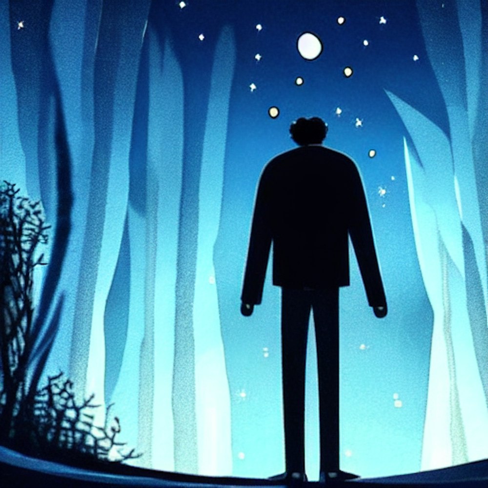 An animation, a lonely night, feels melancholy, blue color, semi real