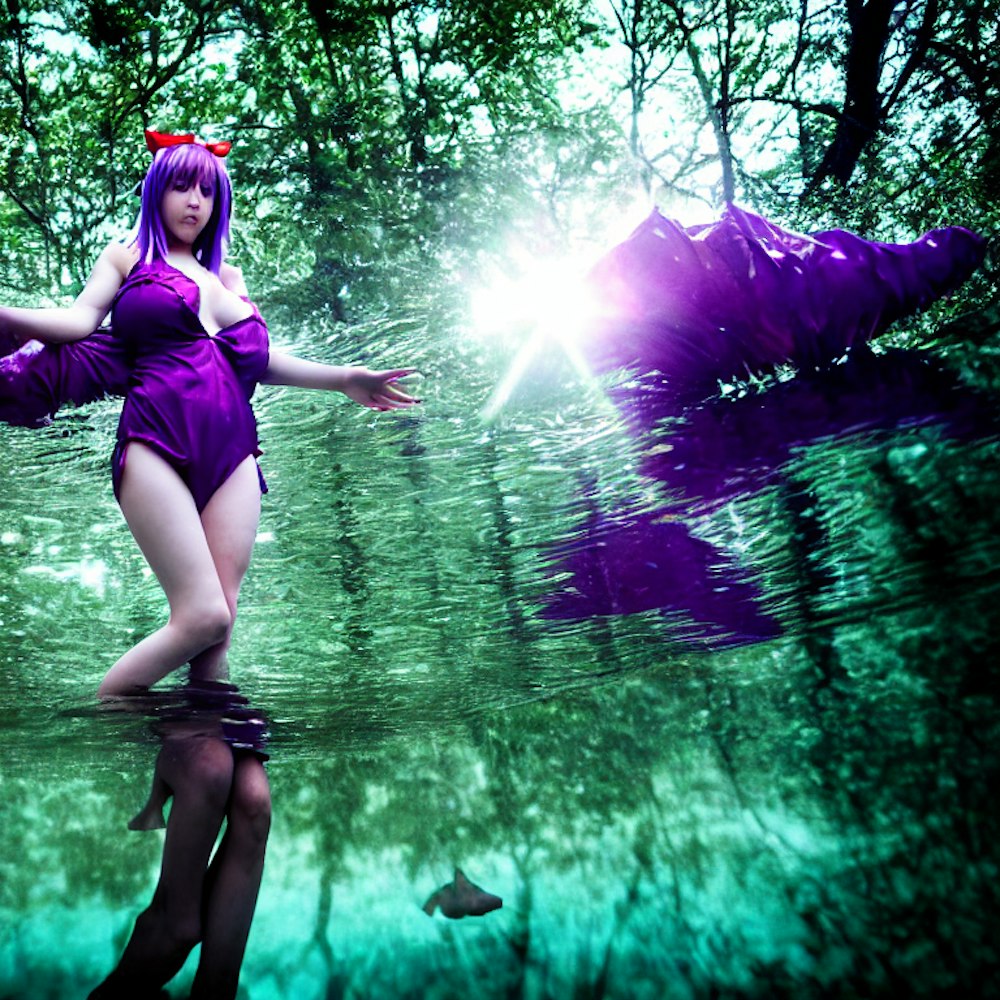 (RAW photo, best quality), high detailed skin, outdoor, Standing in the middle of the water, reflection, backlighting, dark forest, turn around, ankles submerged in water, solo, small breasts, bare legs, anime girl, twintails, hairband, fantasy, high contrast, ink strokes, explosions, over exposure, purple and red tone impression , abstract, ((watercolor painting by John Berkey and Jeremy Mann )) brush strokes, negative space,�