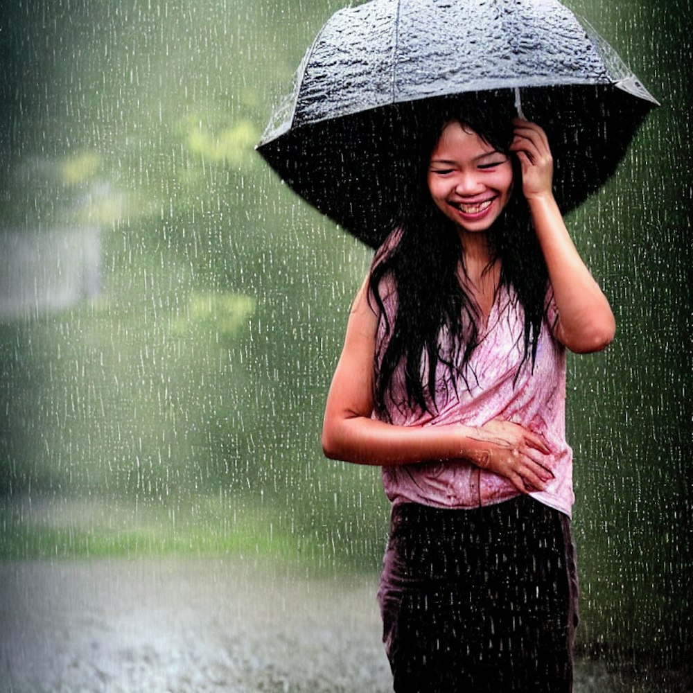 a world washed by the soothing touch of rainfall, capture the essence of a woman's genuine smile as she finds solace and joy in the midst of the downpour. Allow the diffusion of raindrops and the soft lighting to paint a picture of serenity and resilience. Explore the balance between the tranquil ambiance of the rain and the contagious happiness that lights up her face. Let this moment speak of the beauty found in embracing life's storms with unwavering optimism and grace.