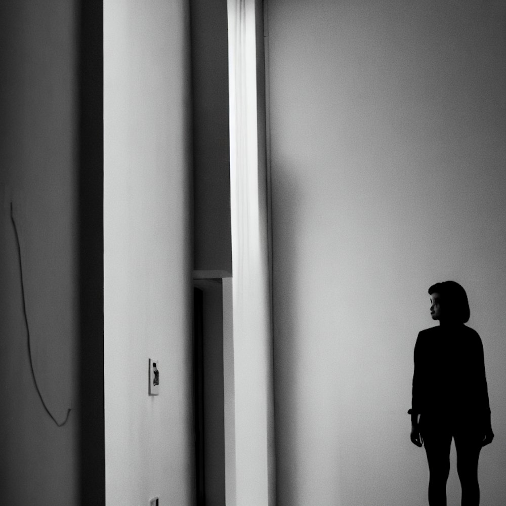 close up face photo of tall featureless woman standing in empty hallway