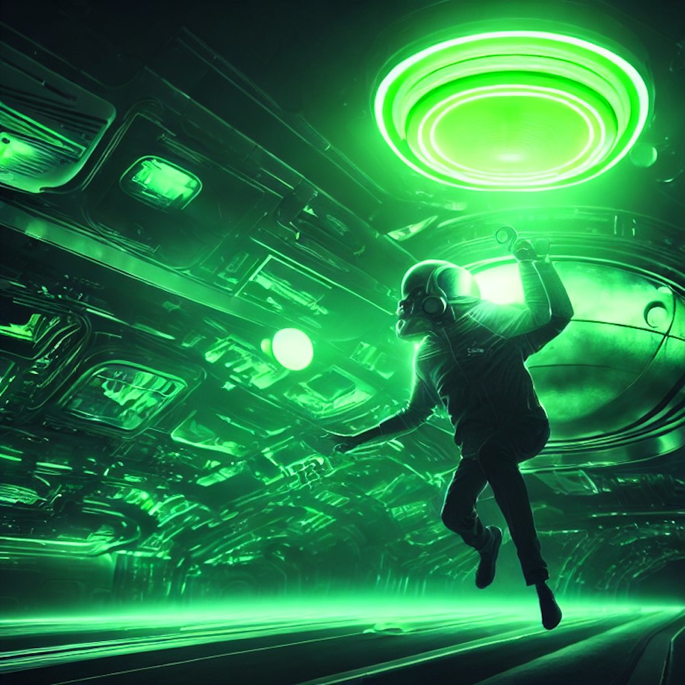 A man being abducted by an alien spacecraft with a green colour palletÂ