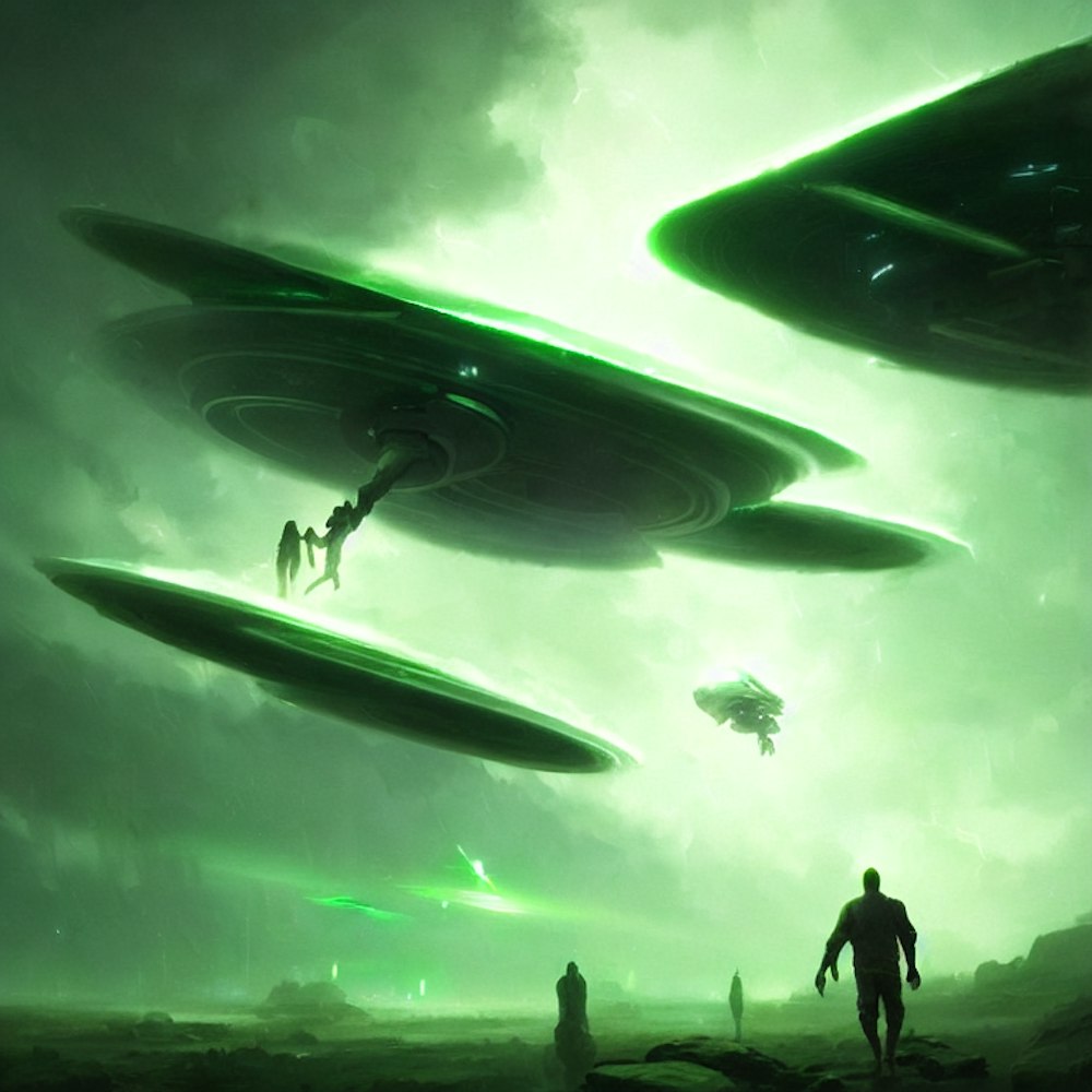 A human man on earth being abducted by an alien spacecraft with a green colour palletÂ