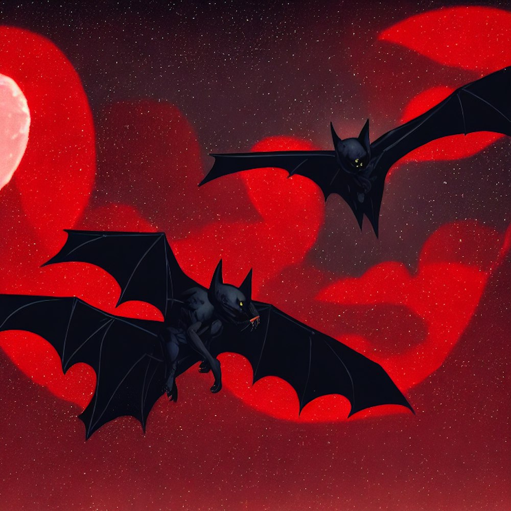 dark bat in the front,  red, white moon, night, reflection