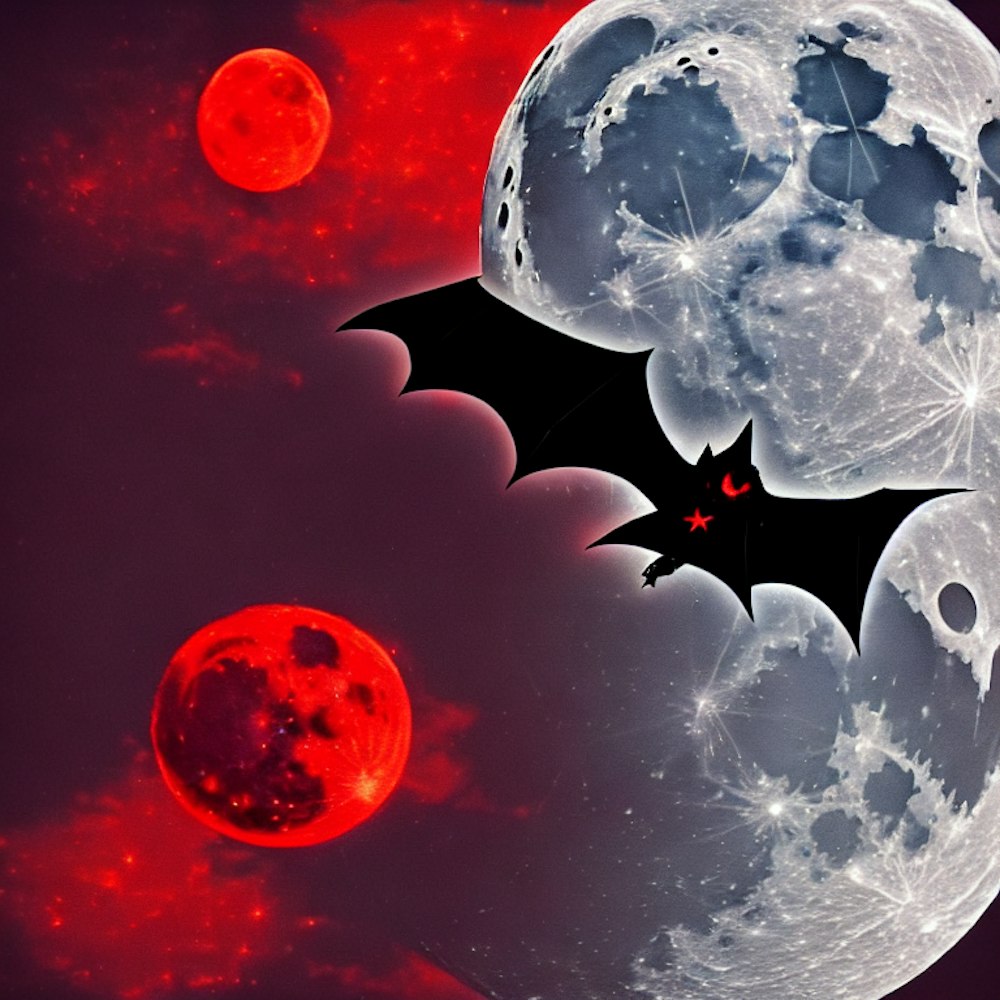 dark bat in the front, red, white moon, night, reflection