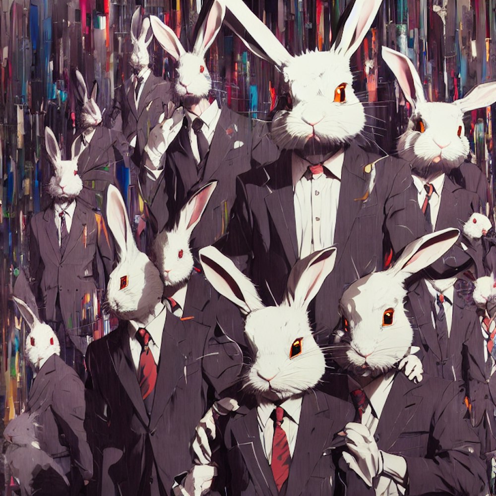 Rabbits in Business Suits, by yoshitomo nara, yoshitaka amano, yoji shinkawa, takashi murakami, krenz cushart, conrad roset, francoise nielly --v4