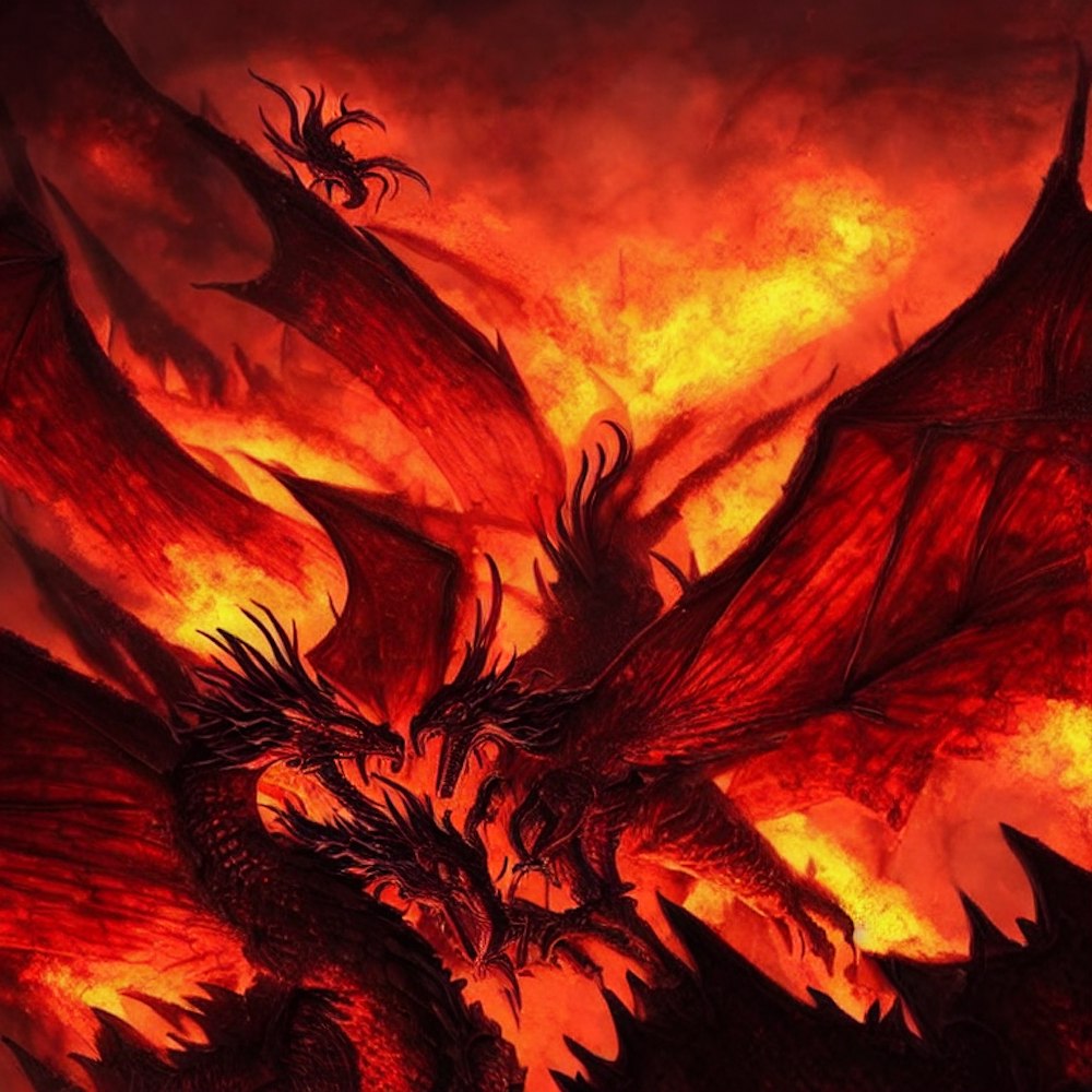 A little village burnig above a red dragon spitting fire. A great village burning. Buildings falling down. Blood raining so much that you can almost feel it.