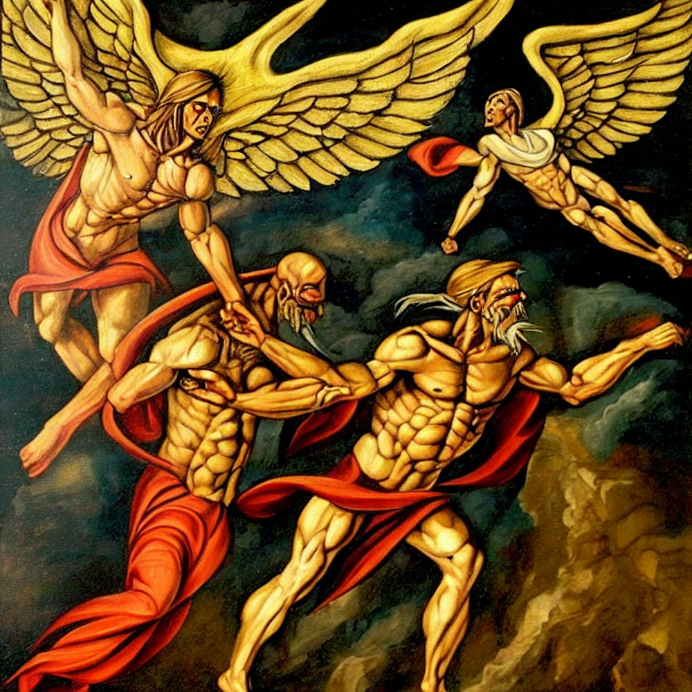 A male humanoid demon named Alizarkah fighting divine Angel, in the style of Jacob fighting an Angel, biblical painting , Israel vs Angel