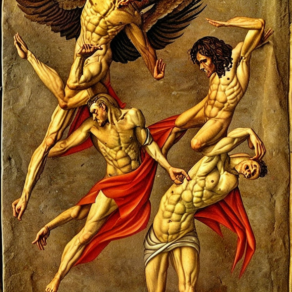 A male humanoid demon named Alizarkah, in the style of Jacob wrestling an Angel, biblical painting, Israel vs Angel, Jacob vs Angel