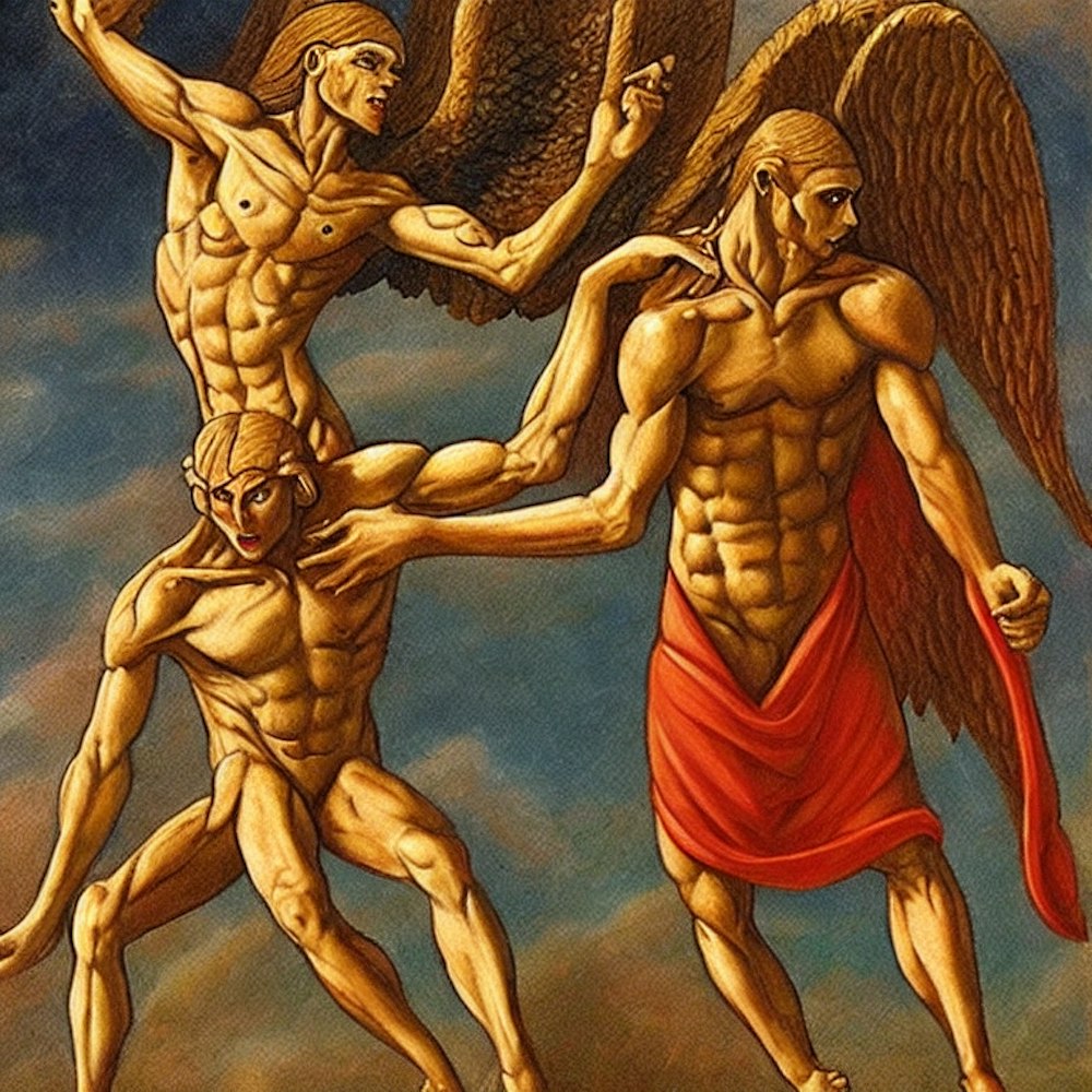 A male humanoid demon named Alizarkah, in the style of Jacob wrestling an Angel, biblical painting, Israel vs Angel, Jacob vs Angel